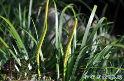 | 石菖の特徴として根茎はが横方向に長く伸びます。根茎は硬くて節が多く、 根からは芳香性のある香りがします。 石菖の根は強く、水辺や岩場でも強く張り付いています。 葉は横に長く伸びる根茎の先から2裂の袴状に群がって生じ、平たい線形で 基部は互いに抱き合っています。 葉の質は丈夫で濃い緑色をしており、葉の長さは約50センチ程、 葉の幅は3ミリから1センチほどに成長します。 葉脈ははっきりと判りません。 葉の表面は光沢があって滑らかです。 花ですが4月から5月頃にそう生する葉の中より緑色で葉状をした茎を出し、 その先に花茎を立てます。 花茎の頂に淡黄色をした幅5ミリぐらい、長さ10センチぐらいの細長い肉穂花序 をつけます。 花序は両性花で花被片が6枚、雄しべが6本で花糸は太くて短いです。 花序より上部には葉状の包があるので一見葉の途中に花穂がついているように 見えます。 花の後にさく果を結びます。種子に長毛を生やしています。 |